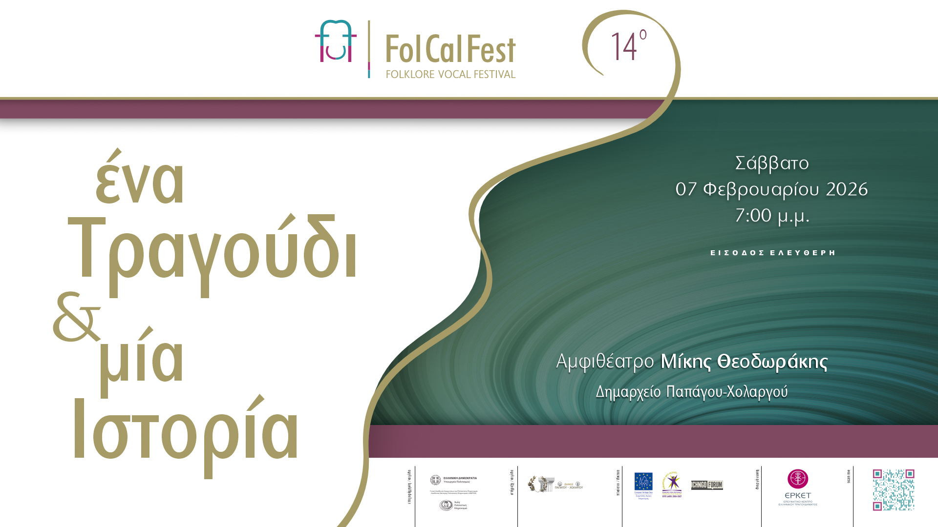 Το Σάββατο 7 Φεβρουαρίου 2026, στις 7:00 μ.μ., το Ερευνητικό Κέντρο Ελληνικού Τραγουδήματος διοργανώνει στο Αμφιθέατρο “Μίκης Θεοδωράκης” στο Δημαρχείο Παπάγου-Χολαργού το 14ο FolCalFest | ένα Τραγούδι & μία Ιστορία, μια γιορτή αφιερωμένη στη δύναμη και στην ωφέλεια των αφηγηματικών τραγουδιών.