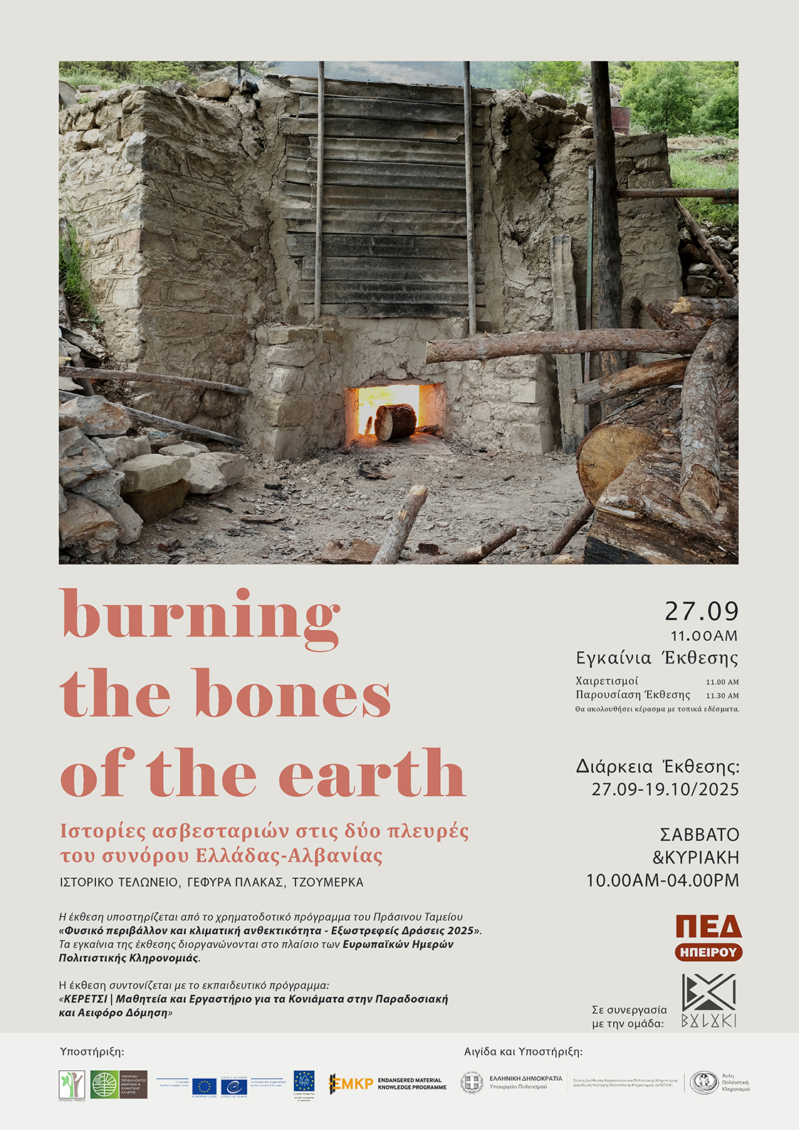Η ομάδα Μπουλούκι και η Περιφερειακή Ένωση Δήμων ΠΕΔ) Ηπείρου σας προσκαλούν στα εγκαίνια της Έκθεσης «Burning the bones of the earth». Τα εγκαίνια της έκθεσης διοργανώνονται στο πλαίσιο των Ευρωπαϊκών Ημερών Πολιτιστικής Κληρονομιάς. Υποστηρίζεται από το χρηματοδοτικό πρόγραμμα του Πράσινου Ταμείου «Φυσικό περιβάλλον και κλιματική ανθεκτικότητα», στο πλαίσιο της πρόσκλησης «Εξωστρεφείς Δράσεις 2025». Την έρευνα και την ανάπτυξη του αρχείου υποστήριξε το πρόγραμμα Endangered Material Knowledge Programme του British Museum.